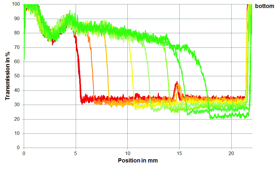 More than 1,600 detectors record the transmitted beam, giving an unprecedented resolution over the entire sample cell of 20 mm height. Kinetics of instantaneous recorded transmission profiles across your whole sample are converted into stability and separation rates. Particle concentration, sediment packing density and X-ray attenuation can also be calculated based on the extinction profiles.