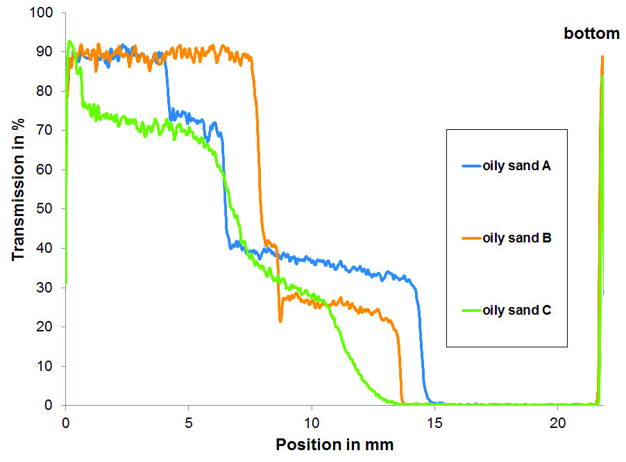 Visual appearance and x-ray intensity profiles of oil sands after separation
